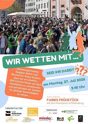 Wir wetten mit Bürgermeisterin Schwieren und Bischof Dr. Klaus Krämer, dass wir es schaffen, am 27. Juli 500 Kinder und Jugendliche auf dem Marktplatz in Rottenburg zum Fairen Frühstück zu versammeln. Gemeinsam setzen wir ein Zeichen für Gemeinschaft und Globale Gerechtigkeit!